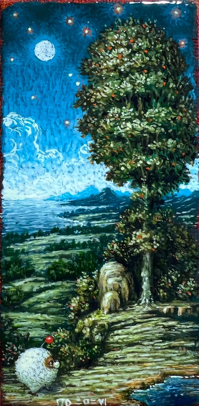 ●岩山とたま(NS-016) NS(ニューシノギ)シリーズ 約90×120×40mm(亜麻布厚含めない) 記名 ITD 二口二V(井上時田大輔 2025) ●支持体 木材に亜麻布張り膠塗布 (綾織 ベラルーシ リネン100% 430g/m2) 本作より亜麻布の張りにタッカーではなく小釘を 採用 ●使用顔料 鉛白(白、塩基性炭酸鉛) 鉛錫黄(乳白色、錫酸鉛) 鉛丹(橙色、四酸化三鉛) 黄土(黄土色、水酸化鉄) 泥炭(黒褐色、ヴァンダイキブラウン ※1) 酢銅緑(緑青色、塩基性酢酸銅 ※2) 松脂銅緑(深緑、樹脂酸銅) クサカベ 黄色透明酸化鉄(黄褐色、酸化鉄) クサカベ 赤色透明酸化鉄(赤褐色、酸化鉄) クサカベ ローアンバー(黒褐色、酸化鉄、二酸化マンガン) ※1 部分水和酸化鉄(III) + 部分水和酸化マンガン + フミン酸 ※2炭酸銅に酢酸を反応させてから(酢酸銅)松脂と短時間加熱反応させたもの ●固着剤 明るい不透明色は全卵をテレピンにテレピン溶蜜蝋やテレピン溶松脂、亜麻仁油、蜂蜜等を顔料に合わせて混ぜたもの 暗い透明色はテレピン溶ロジンを顔料と共に加熱して処理しペースト状にしたものに卵黄を加えたもの ※テレピン 松の樹液等から精製した揮発油。残ったものがロジンとなる ●メディウム(この場合は絵具を溶く為の助剤) 卵黄粉末に水を加えたもの 水に蜂蜜を加えたもの ガムテレピン(恐らくペトロール、ホワイトスピリットの類) 今回のロット(NS-009~)から下描き→ワニス→白明部→ワニス着彩、暗部→ワニス→仕上げ→ワニス という十余年前に自分がやっていた描き方に少し近いものを採用してみた。これは変色傾向があった酢酸銅の変化を防止する為の処置だが透明感と良い艶がありなかなか良い。 ●大義名分 根本理念として 古典的で身近で安価※な材料で自分が納得できる絵画 ※(この場合の安価とは天然ウルトラマリンやアズライト等高価で貴重な天然資源顔料等は精神衛生上使いづらいので、自分自身で常にストックできる範囲の価格という意味である。あくまで旧日の画家たちが身近な材料で絵画を制作していたであろうから、その様でありたいという考え) 展示頻度を抑えて、よりクオリティの高い絵を描こうという試みのさなか、小さめの絵を描いて糊口をしのぎたい…思惑の元制作されているものたち。もともと細密画を描いていたので原点回帰かもしれない。 市販キャンバスを基底材に張るより生亜麻布を張ってから膠引きした方がより頑丈ではと思い綾織の耐久度の高い亜麻布を張った。普通のキャンバスと違い綾織特有の斜めのラインが独特であるが割と昔のキャンバスは様々な丈夫な織りのものが使われてきたので歴史的でもある。 粒子が大きくて使いづらかった絵具たちを篩で裏漉ししたら大分滑らかで使いやすくなったので中々よい。 少し前は安筆に膠で細密描写しやすい様に穂先を固めたものを使っていたが、タミヤの筆が価格の割に大変使いやすい為今はもっぱらタミヤの筆ばかり使っている。 また細密描写の為に眼鏡型の4倍拡大鏡を使用し始めたので細密描写が大変しやすい。数時間使用後は一時的に視力が著しく悪くなるがGrokくん曰く基本的には問題ないらしい。寝ると回復する。 画題というか商品名というかまあタイトルは基本的つけないのだが展示では便宜的につけたり、ニューシノギたちでは必要なもの以外は付けないと思いNS-0H-00…という形にしていたが、あまりに管理番号的かもしれないと思いNS-004から大凡の画題を付記してみた。またサイズも色々あるので0H(0号のhalf)等 外した。 あくまで「この場面を描いているよ」というもので本質的に絵のタイトルは見た人が各自各々つけてよいと思う。 ★★★内容★★★ 海が見えて変な岩山も見えて空が広くて樹もある。月みたいなのもある。大変に気持ちがいい場所。こういう場所に居たい。 描かれているたぬき玉みたいなのは多分石の下にいっぱいいる。 ●その他 支持体の後ろに穴があるので画鋲やビスを掛けられて非常に便利がよい。 自作差し箱に入れて発送します。 布袋はありません。 保護紙とプチプチに包まれます。