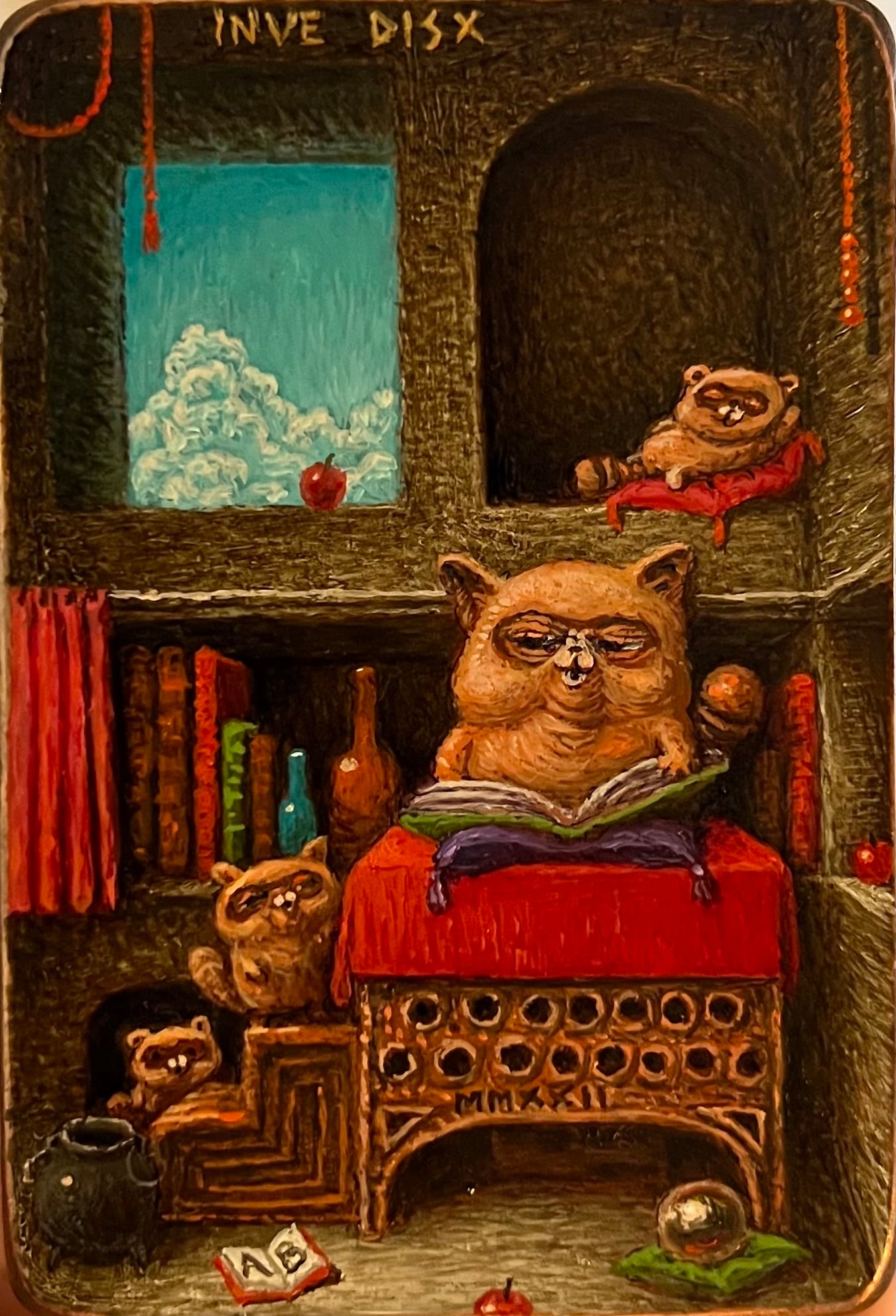 ◉『老たぬき』◉ (題名については適当に作者が付けているだけなので各々好きに呼んでよいです) ◉作品について アルブレヒト・デューラーの「書斎の聖ヒエロニムス」のオマージュ。 あまりたぬきが歳を取って老いた状態を描いてこなかったけど多分気分で老いるのだと思う。 ◉素材情報 サイズ 161×111×16mm(麻布厚み含む) 支持体 穴を開けたシナ材に生亜麻布小釘張り 薄手で緻密な織りの亜麻布 膠目止め 半油性地 ◉使用色材 油絵具 顔料 樹脂酸銅 ◉画用液 リモネン溶ダンマルワニス(加熱溶解)+金属シッカチフ ◉発送等 国内ヤマト運輸 海外EMS 作品表面にシリコン紙を張り、プチプチで包んで自作の差し箱に入れ再度プチプチに包んで発送します。 ◉ “Old Tanuki” ◉ (The title is just something the artist casually stuck on, so feel free to call it whatever you like.) ◉ About the Work An homage to Albrecht Dürer’s “Saint Jerome in His Study.” I haven’t really painted tanuki in an aged, elderly state very often, but I figure they probably age whenever the mood strikes them. ◉ Materials Information Size 161 × 111 × 16 mm (including the thickness of the linen canvas) ◉Support - Raw linen stretched with small tacks onto perforated lauan plywood - Thin, finely woven linen canvas - Animal glue sizing - Semi-oil ground ◉Pigments / Oil Paints Used Oil paints Pigments (various) Copper resinate ◉Painting Medium Limestone-dissolved dammar varnish (heat-dissolved) + metal siccative ◉Shipping - Domestic: Yamato Transport (Japan) - International: EMS The painting surface is protected with silicon release paper, then wrapped in bubble wrap, placed in a custom-made shipping box, and wrapped again in bubble wrap before sending.