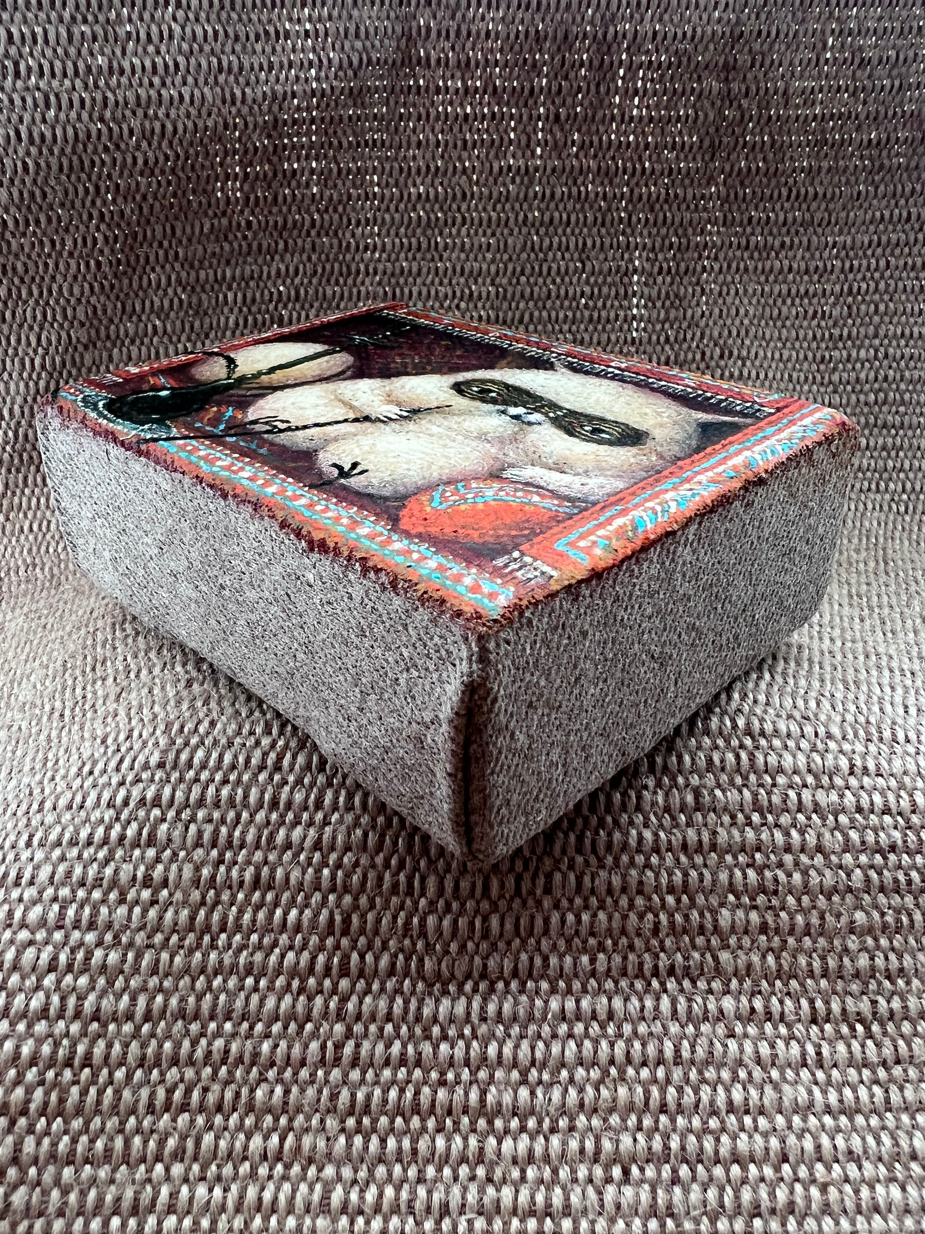 自分が抱くたぬきの基本様態のひとつ。手織りの絨毯とか織物に囲まれた壁龕(ニッチ)の様な窪みで水煙草をやっている。西アジア的。