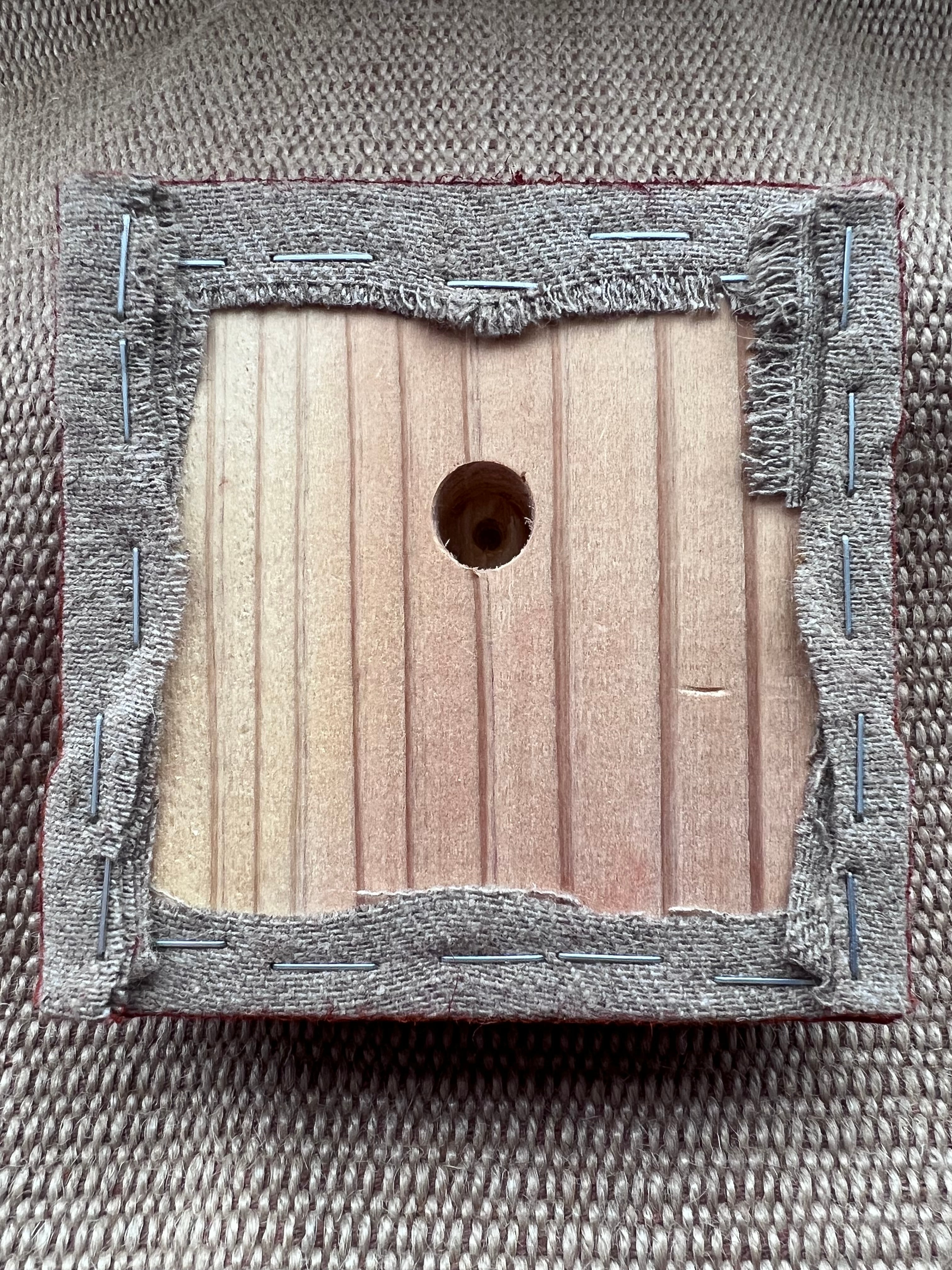 木材に亜麻布張り膠塗布、側面弁柄塗布