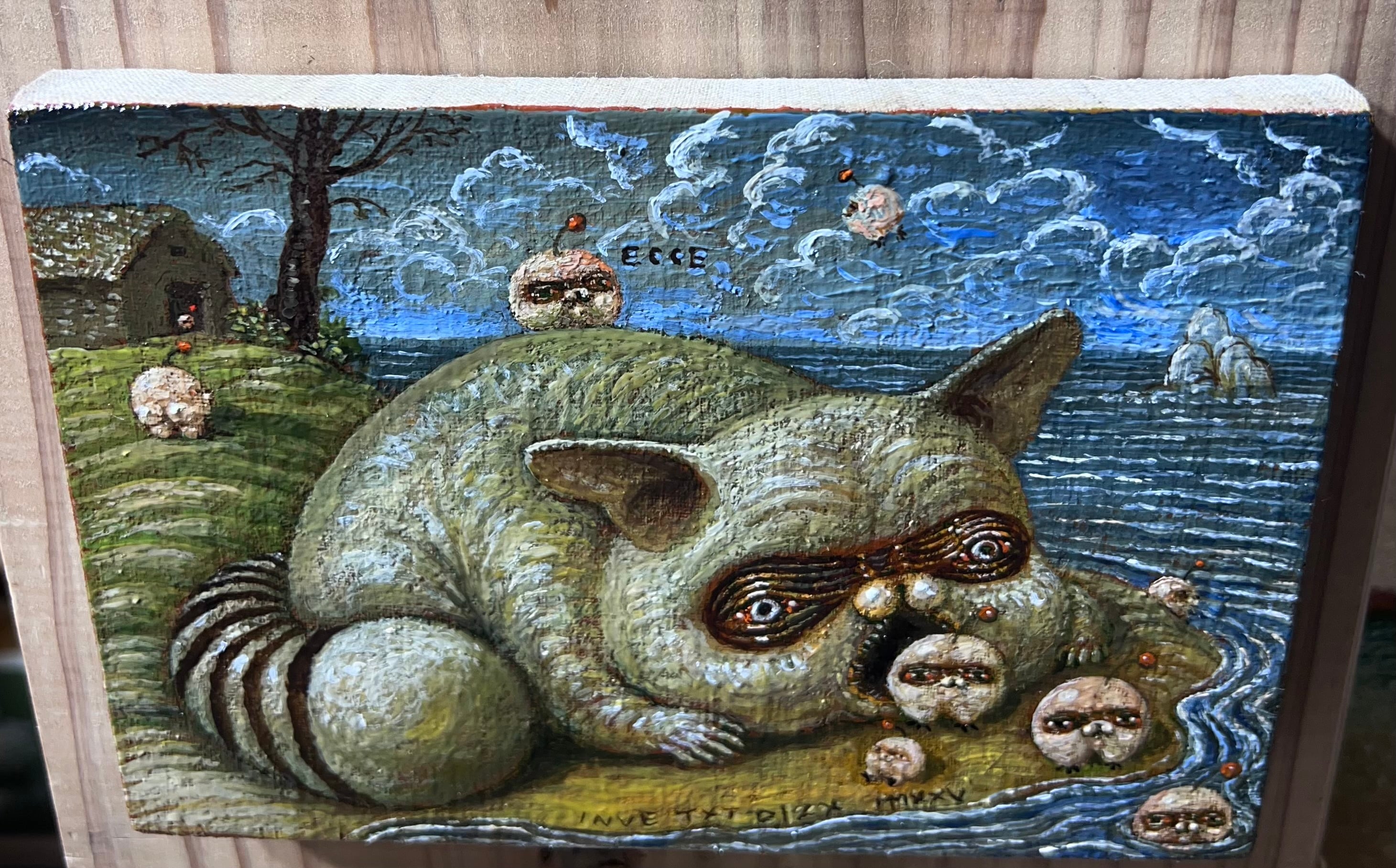 ◼︎ピーテル・ブリューゲル(父)の銅版画「大きい魚は小さい魚を喰らう」のたぬき版。元はネーデルラントの諺、でかい魚は小さい魚食ってんだから人間だって食べなきゃいけないし、他の奴を蹴落としたりするのは悪い事じゃ無いねんな…みたいな感じの意味だったと思う。まあたくましく生きなきゃね。