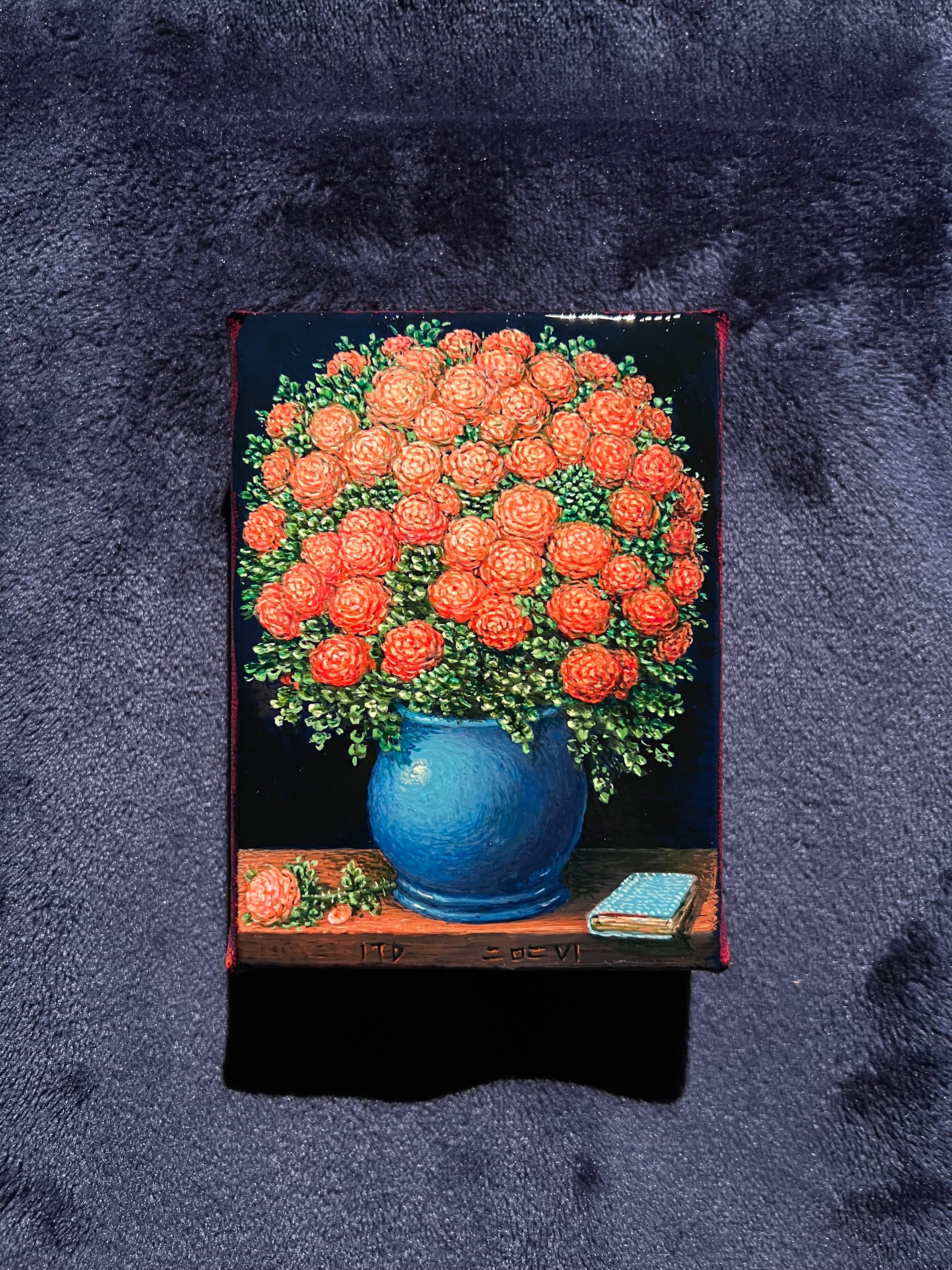 I painted this because I wanted to create a still life. It’s a rose-like something. At the stage of simply thinking “I want to paint a still life,” I didn’t work from direct observation of real objects. Instead, it’s based on my personal desires and fixed ideas about how roses, flowers, and a vase (?) should look.