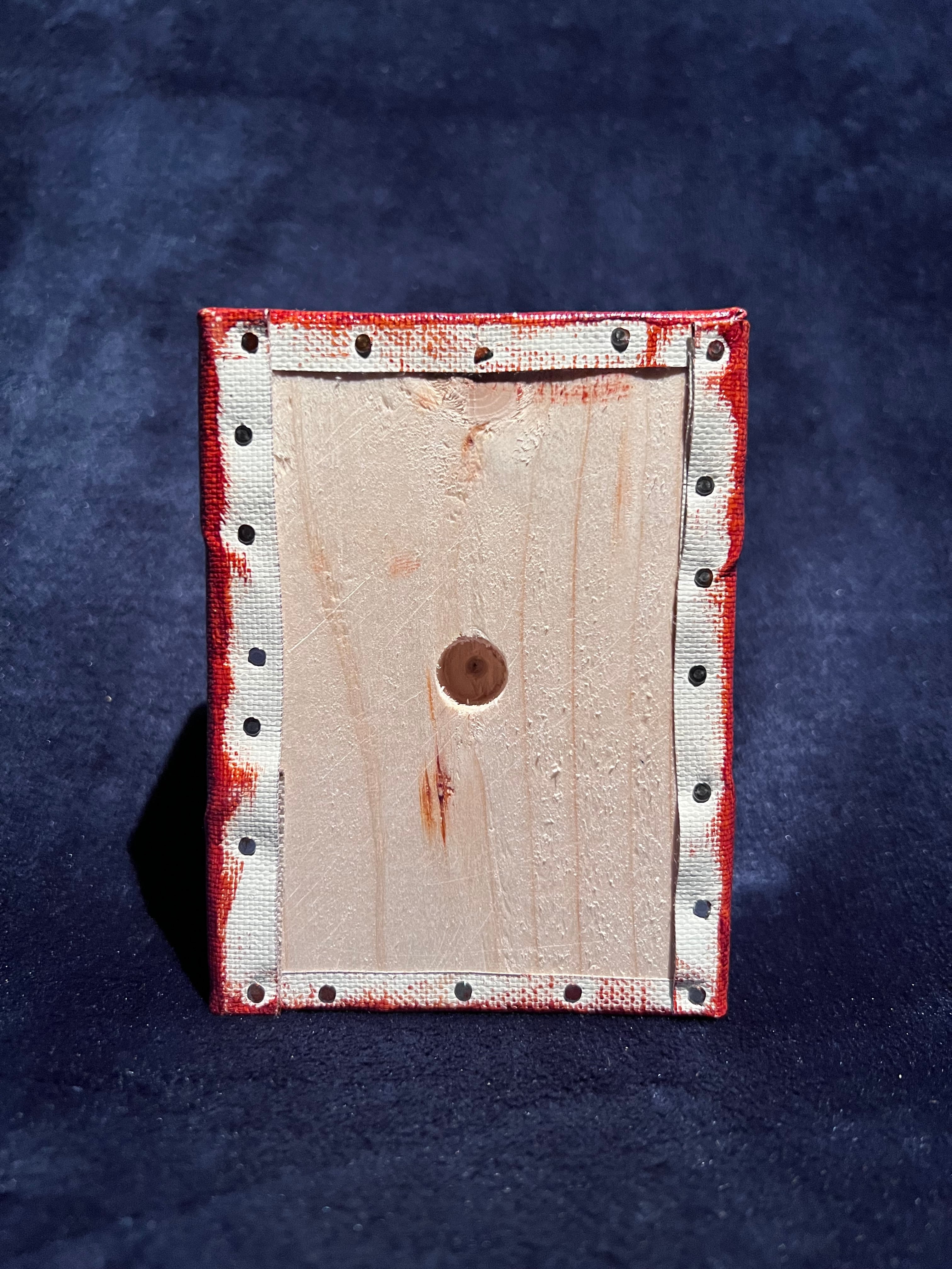 Coniferous wood panel with pre-primed canvas stretched and secured with small nails (includes hanging hole on the back)